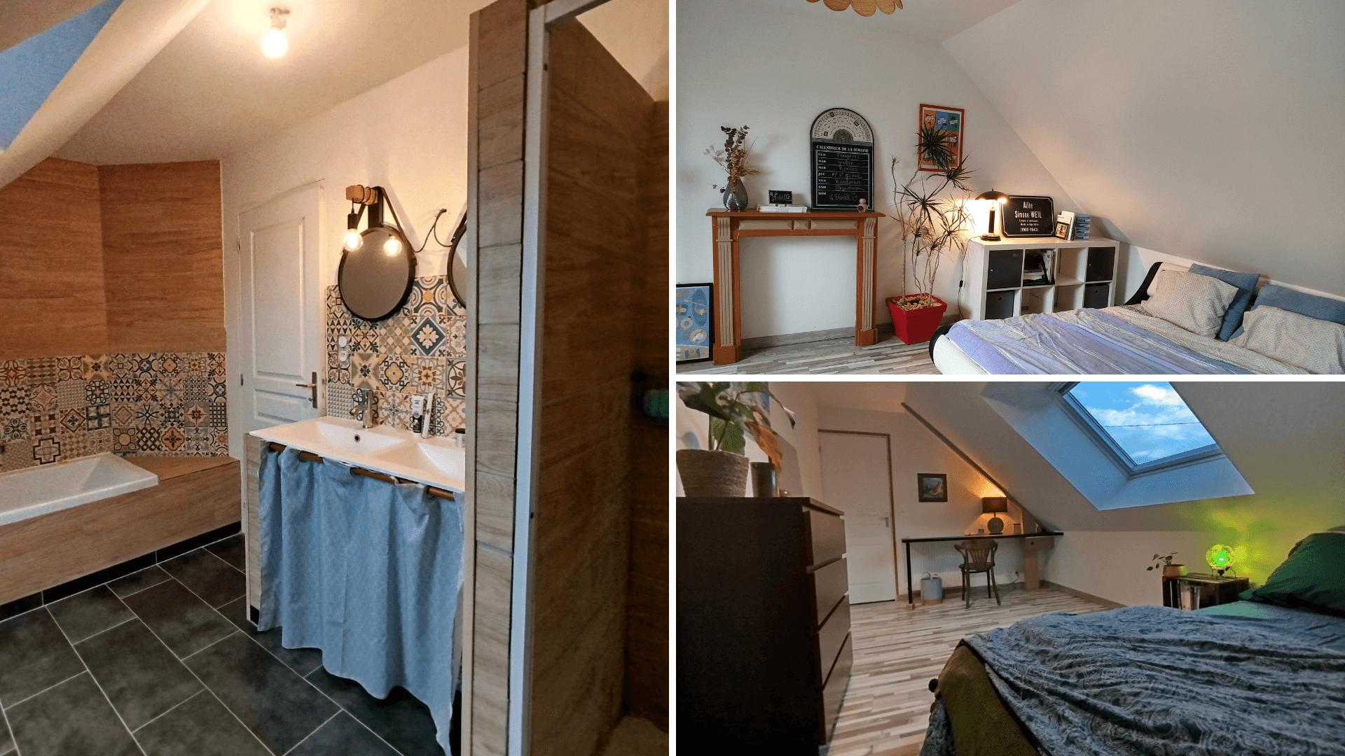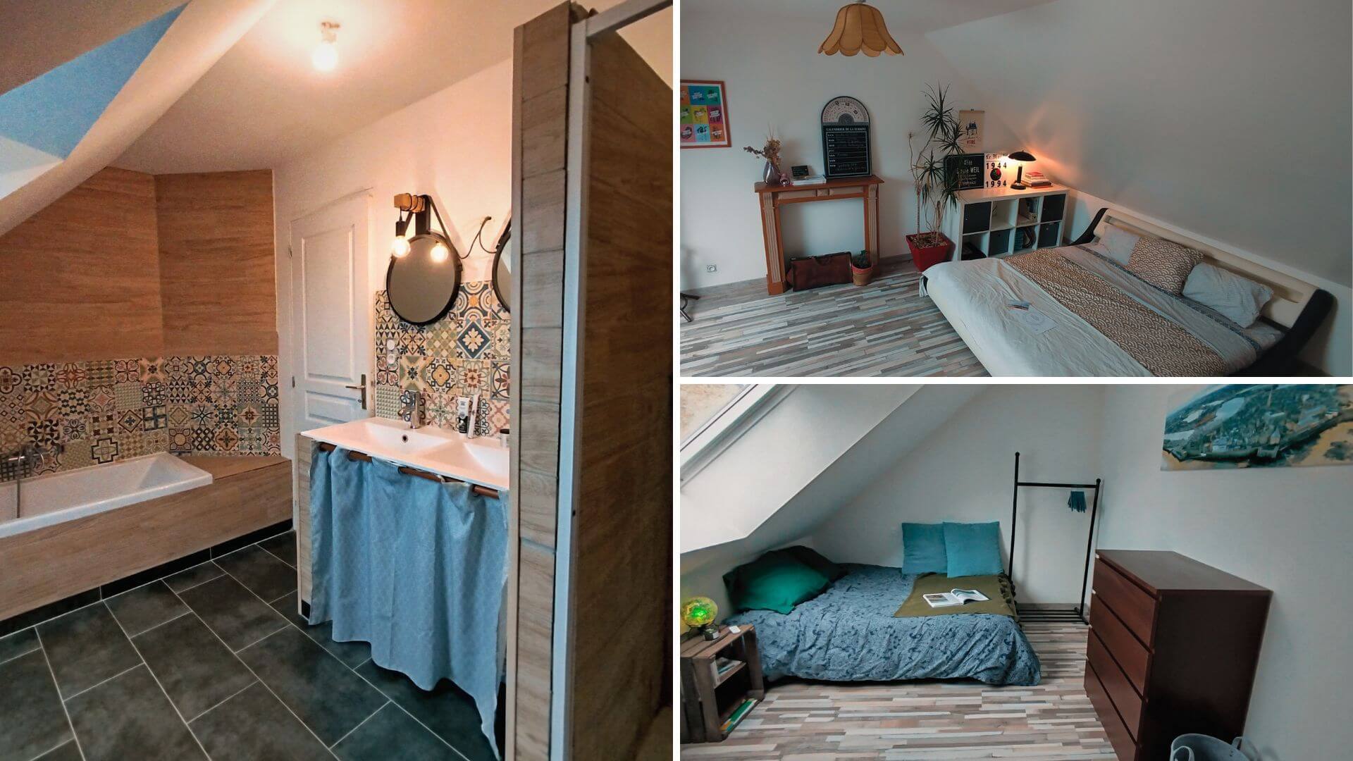 The first bedroom, bright and modern, features a large desk and plenty of storage. The second, mirroring the first, offers a magnificent view of the countryside and the pond. The last bedroom, more spacious, retains its original stone wall and offers a beautiful view of the garden and pond. Between the two, a cozy living room with a sofa, library, and TV is reserved for you. You will also enjoy your own bathroom (bath + shower) and separate toilet.